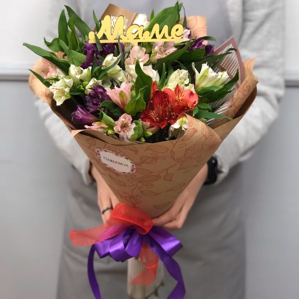 Стильный и стойкий монобукет из 11 альстромерий микс в крафт бумаге с добавлением тематического топпера.