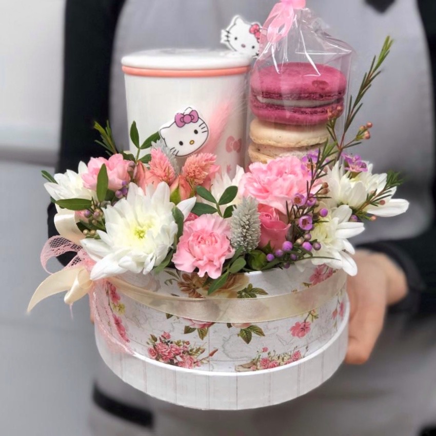 Авторский набор в круглой коробке с нежной цветочной композицией, кружкой и печеньем макаронс.